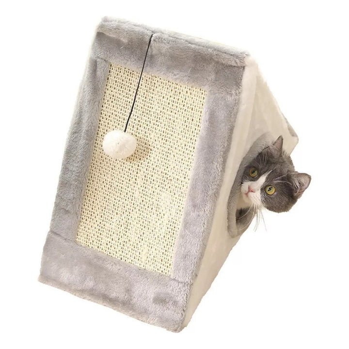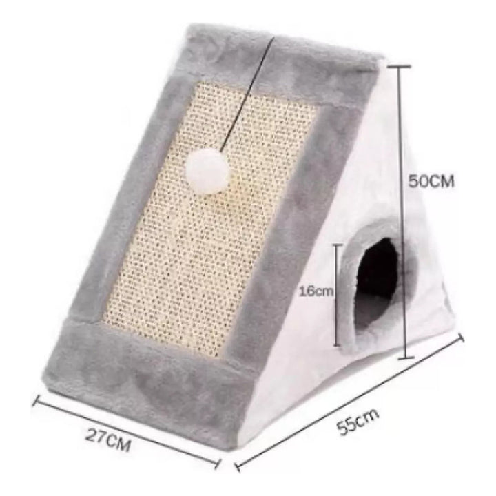Rascador de Gato + Casita y Pompon MX27 Ofrece a tu gato un refugio completo de diversión y comodidad con nuestro encantador Rascador de Gato + Casita Triangular + Pompon MX27. Esta innovadora estructura triangular combina una acogedora casita con un rascador funcional en una de sus paredes exteriores, donde encontrarás un divertido pompon adjunto. Tu gato podrá disfrutar de momentos de relajación en la casita mientras afila sus uñas en el rascador. El pompon proporciona entretenimiento adicional y estimula su instinto de caza. Con materiales de alta calidad y un diseño compacto, este rascador se adapta a cualquier espacio. Brinda a tu gato un lugar personalizado para satisfacer sus necesidades de juego y descanso con el Rascador de Gato + Casita Triangular + Pompon MX27. Especificaciones: * Cantidad de Niveles:1 * Incluye Casita: Si * Forma de casa: Triangular * Incluye Juguetes: Si * Cantidad de Juguetes: 1 ________________________________________________________