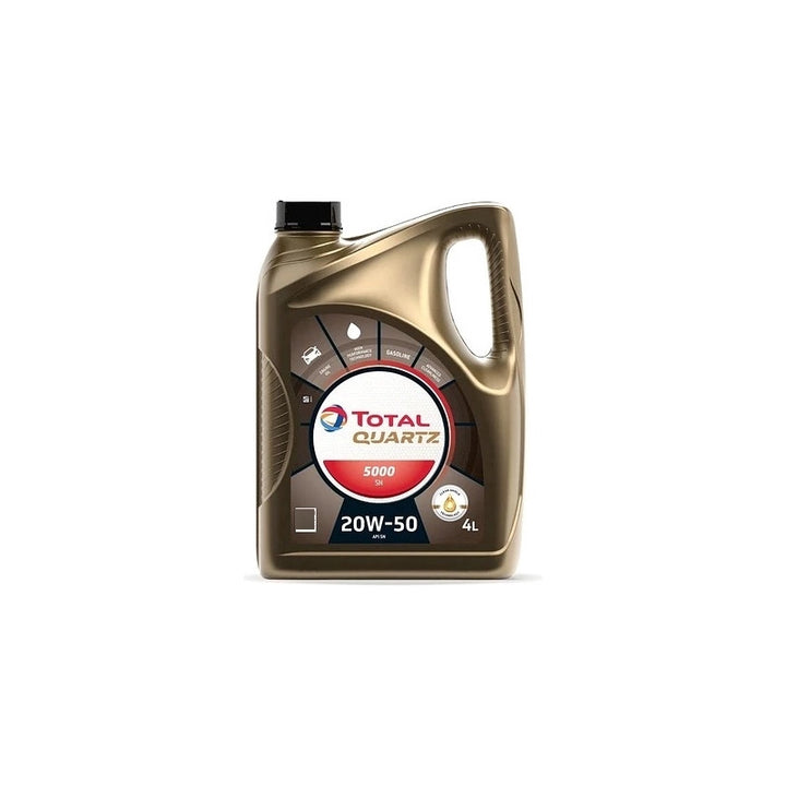 TOTAL QUARTZ 5000 20W-50 es un lubricante, concebido para responder a las exigencias de los motores de vehículos con motores de aspiración natural e incluso motores sobrealimentados, apto para ser usado en motorizaciones con GNC o GLP. Está indicado para todos los tipos de conducción: autopista, circulación urbana. Recomendándose su uso en todas las estaciones del año. Está adaptado para ser utilizado en vehículos dotados de catalizador y es compatible con el uso de bencina sin plomo. Especificaciones: API SN / CF