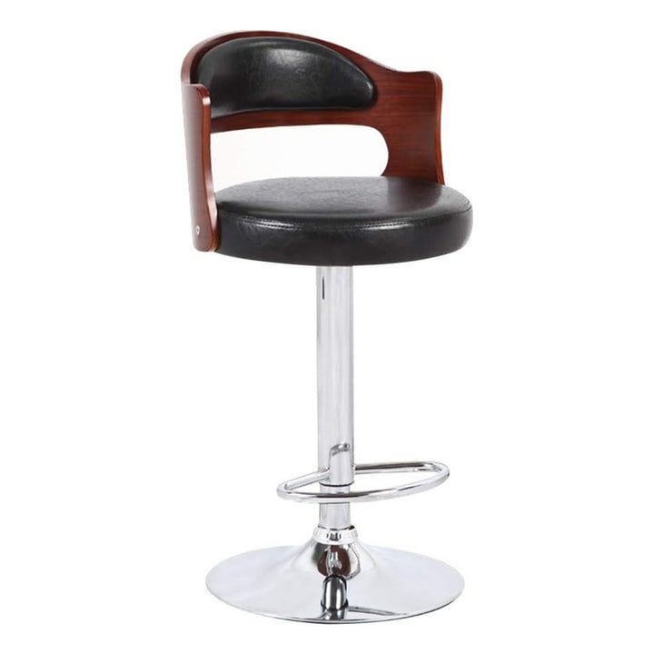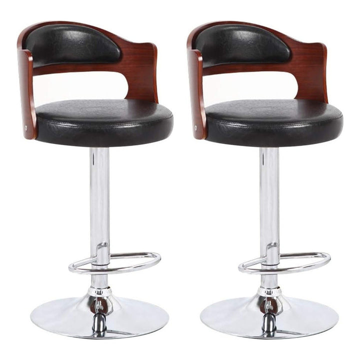 Set de 2 elegantes pisos de bar de altura ajustable, son perfectos para usarlos diariamente en espacios que buscan versatilidad, color y un look diferente. Su asiento de madera tapizado en eco cuero color negro le dan un estilo vintage y elegante. Pack de 2 pisos/sillas. Especificaciones Técnicas: Color: Negro-café moro-plateado Material base: Metal Material cojín: Eco-cuero Material respaldo: Madera Altura Ajustable. Peso: 15 kilos. Peso máximo: 120 kilos.