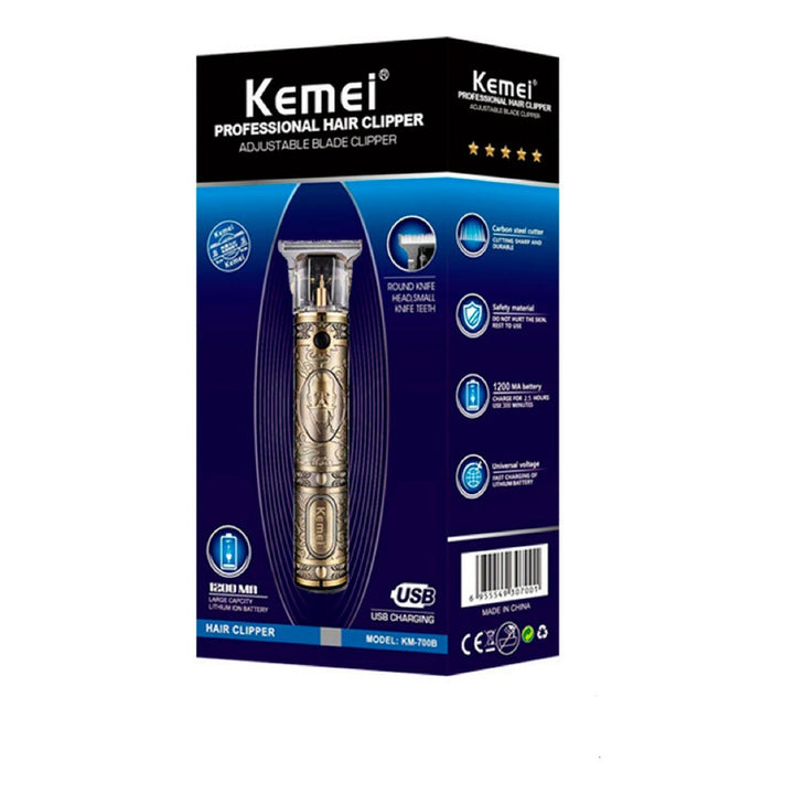 Cortadora de pelos recargable con hoja de acero resistente y diseño ergonómico, apto para uso profesional y doméstico Motor fuerte y bajo nivel de ruido. Características: La hoja se redondea y toca la piel suavemente, evitando accidentes y no daña la superficie de la piel. La hoja tiene forma hueca. El motor profesional y potente de diez vatios tiene potencia emergente, la hoja es afilada y poderosa, y el pelo es capturado y cortado uniformemente, que es rápido y ahorra mano de obra, y el ruido se controla. Tres peines límite de diferentes longitudes son adecuados para diferentes tipos de cabello y pueden ser utilizados por diferentes personas. Tipo de potencia recargable Voltaje global Universal (100-240V) Material de la hoja de acero al carbono Tiempo de carga2.5h * Cortadora de Pelo Kemei KM-700B * 1* clipper de pelo * 1*cable USB * 1*aceite * 1* cepillo * peine de límite ________________________________________________________