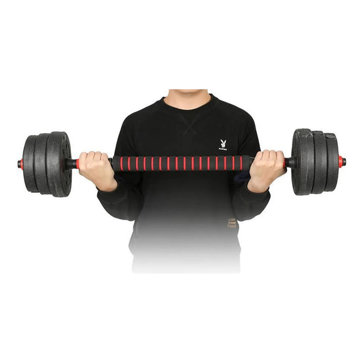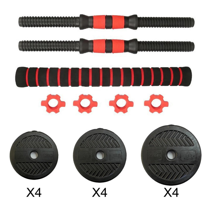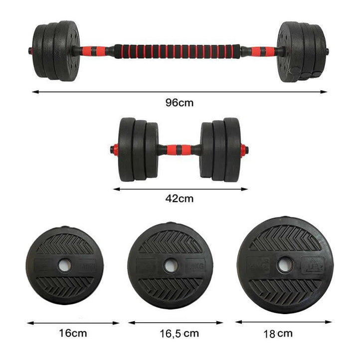 Equipo fitness con barra ajustable enlace 2 en 1, juego de mancuernas para entrenar el cuerpo en el hogar. Mancuernas y pesas para hombres y mujeres. Características: * 10kg por Mancuerna * Extensor acolchado * Puede ajustar los discos de acuerdo al peso que necesite. * Material discos : cemento revestido. * Mango de metal con pvc.
