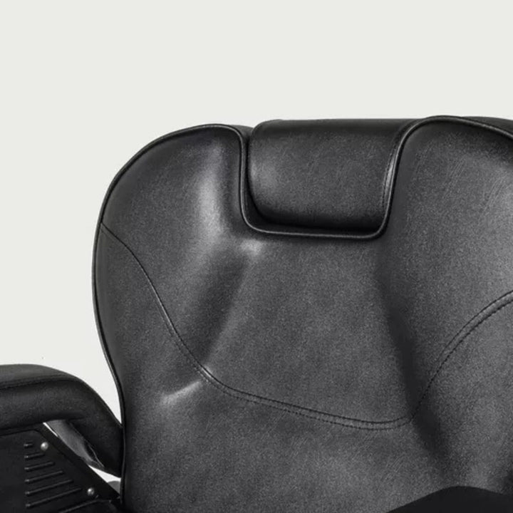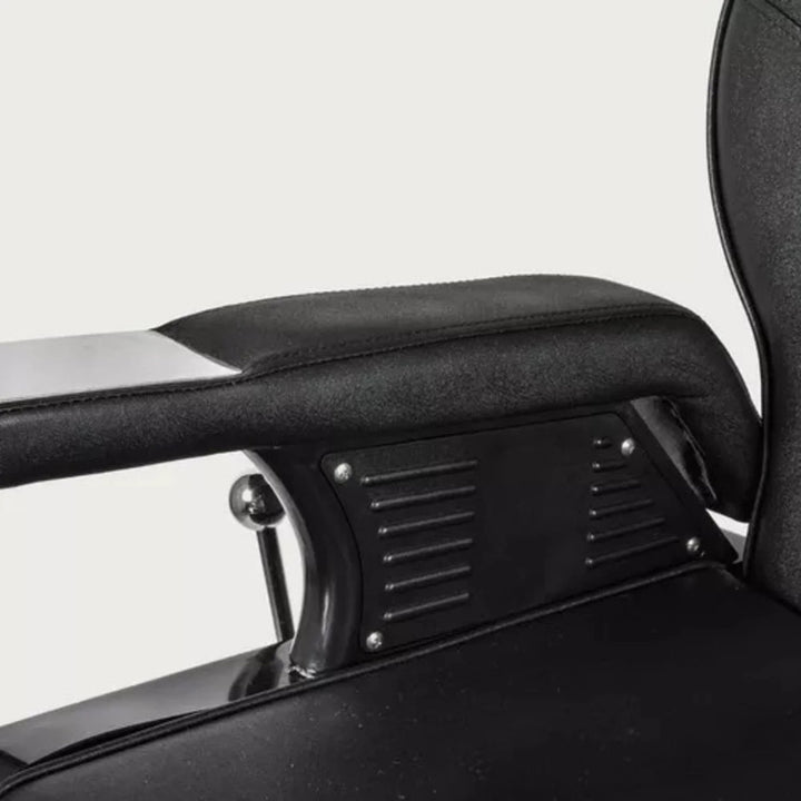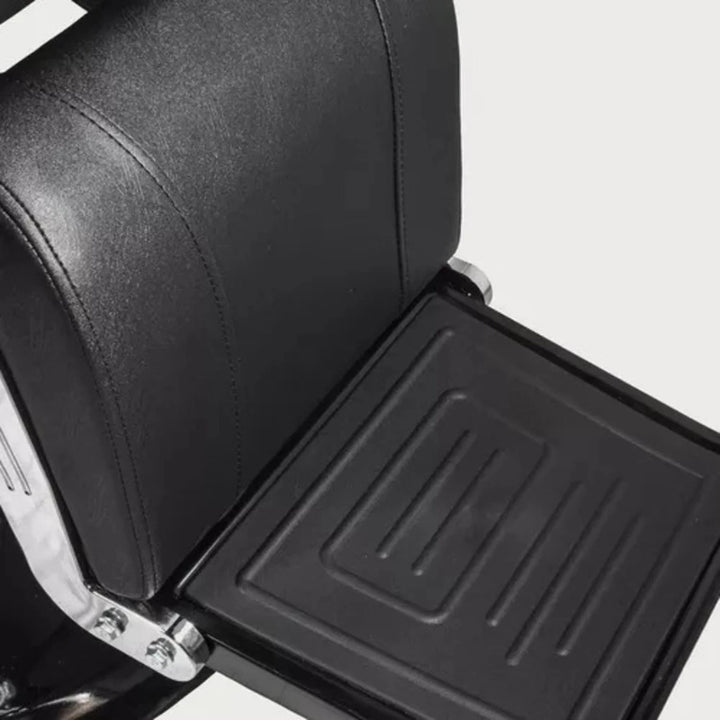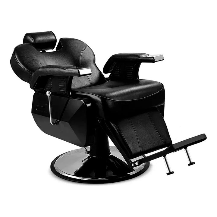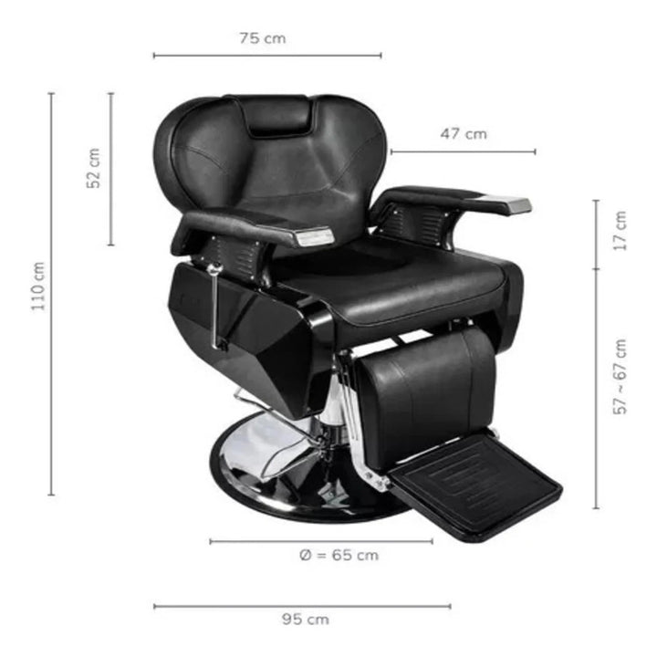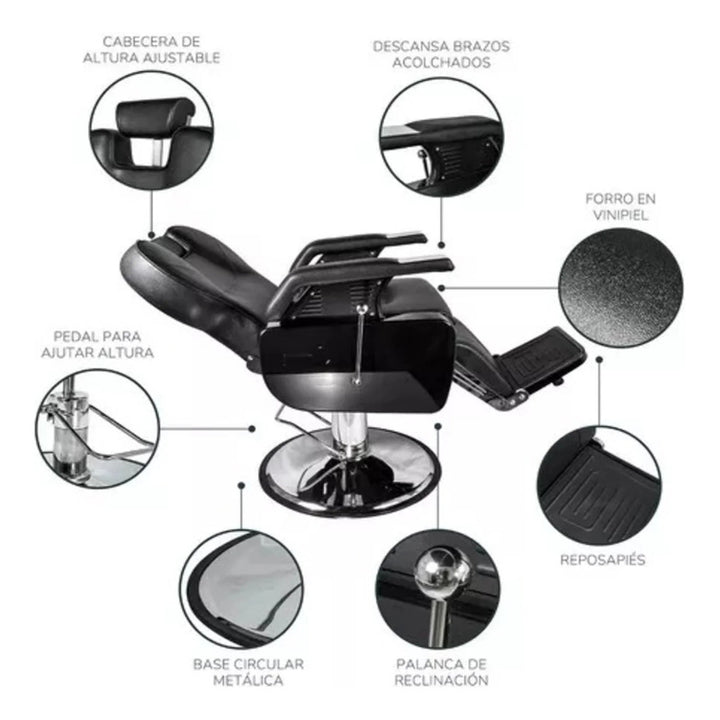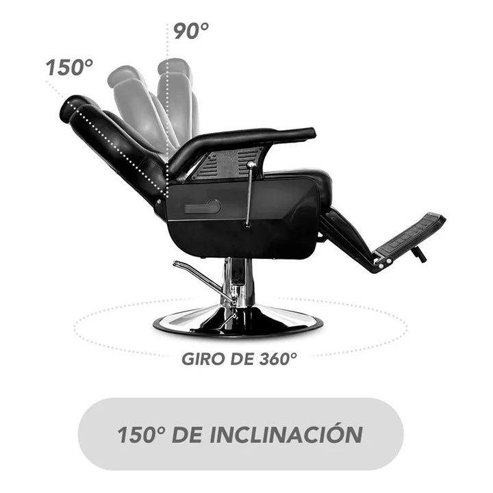 Sillón de Barbería PRO Color Negro. Diseñado para barberías, es reclinable, permite al barbero trabajar con mayor comodidad. El apoya cabeza se puede ajustar o retirar. Especificaciones: Material: Ecocuero. Acolchado: Esponja de alta densidad. Altura ajustable: 15 cm aproximadamente. Capacidad de elevación: 180 KGS. Elevador hidráulico. Dimensiones embalaje: Medidas: 74x81x73 cms / Peso: 53Kgs