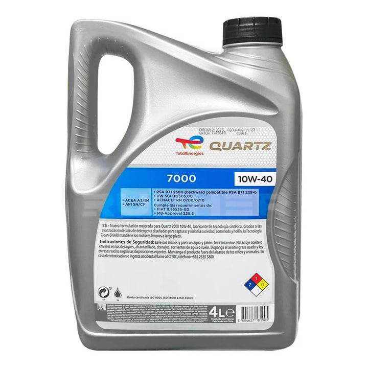 Aceite de Motor Total 10W40 SN 4L fue diseñado para el cuidado efectivo del motor, su gran efectividad cubre las exigentes demandas del mercado automotriz. Es un producto elaborado con aditivos que previenen la oxidación y la herrumbre, funciona eficazmente en condiciones operativas exigentes, cumpliendo los estándares más altos de rendimiento, alcanzando una calidad insuperable, lo que le permite obtener mayores intervalos de cambios, ahorrar combustible y por supuesto controlar las emisiones, con alta tecnología de lubricación. Cuando las condiciones de tráfico son exigentes y utilizas un lubricante de baja calidad tu motor sufre, por lo que escoger un aceite de motor eficiente es la mejor manera de preservar su potencia.