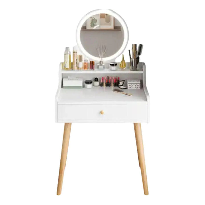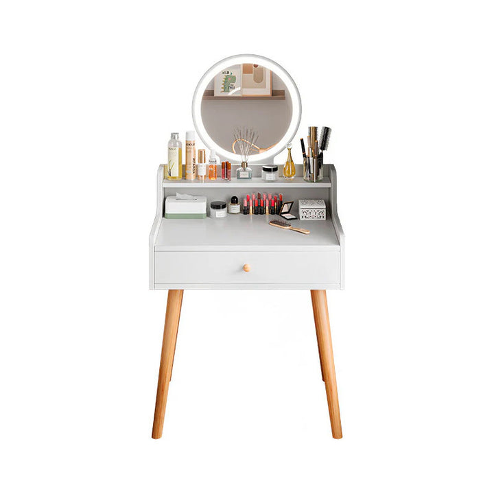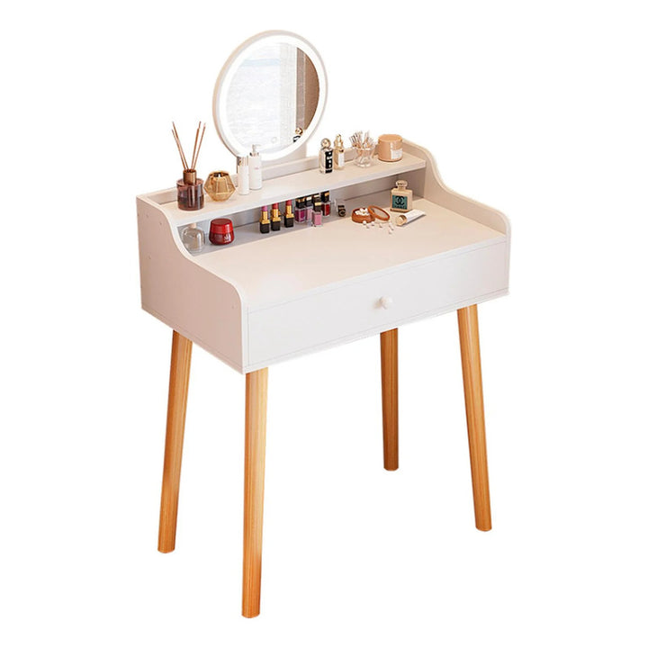Cajón a prueba de luz y polvo: proteja sus preciados cosméticos de la luz y el polvo, preservando su calidad durante períodos más largos. Pies delgados para tocador: Ya sea que esté sentado o de pie, apreciará el cuidado que hemos puesto para garantizar que sus piernas largas se sientan a gusto durante sus sesiones de maquillaje. Diseño envolvente de tres caras: evita que todo tipo de cosméticos se caigan, asegurando un almacenamiento seguro y un fácil acceso. Mango de madera maciza: Disfruta de una sensación cómoda y delicada mientras mejora el agarre para abrir y cerrar cómodamente el cajón. Acogedora escena de dormitorio: crea un aspecto relajado y elegante en tu dormitorio con este tocador de maquillaje, por lo que es un complemento perfecto junto a tu cama.