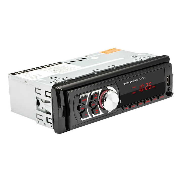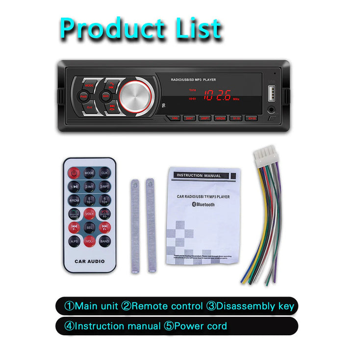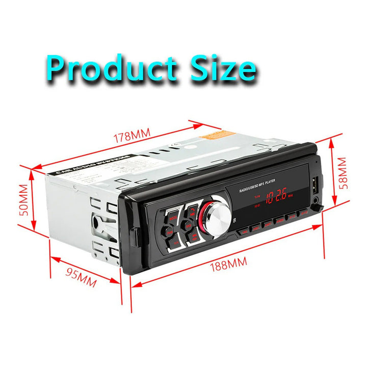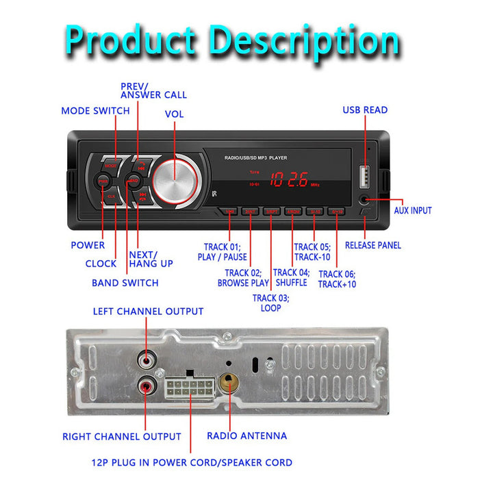 RDS(Radio Digital) Reproductor MP3 multifunción Bluetooth para vehículo Especificación de producto: Bluetooth incorporado Admite llamadas manos libres. Admite modo de transmisión de audio avanzado. Admite el reloj que indica que la alimentación está apagada. Radio FM estéreo digital de alta calidad Admite FM1-FM2-FM3 de tienda de radio de tres bandas y puede configurar 18 estaciones de radio. (Radiofrecuencia: 87,5-108MHz) Soporte USB/lector de tarjetas TF Admite audio: formatos MP3/WMA/WAV, etc. Apoyo carpeta jugar función Soporte de control remoto Rotary control electrónico de volumen MP3 play admite Pausa/vista previa/repetición/Reproducción aleatoria y 10 pistas de selección up/down. Tipo electrónico bajo/agudos/equilibrio izquierdo y derecho/control de volumen del balance delantero y trasero Orificio de entrada de audio auxiliar terminal delantero y trasero orificio de salida de audio RCA L / R. Salida de alta potencia de 4 vías (4 altavoces de alta potencia) Voltaje de trabajo: DC12V