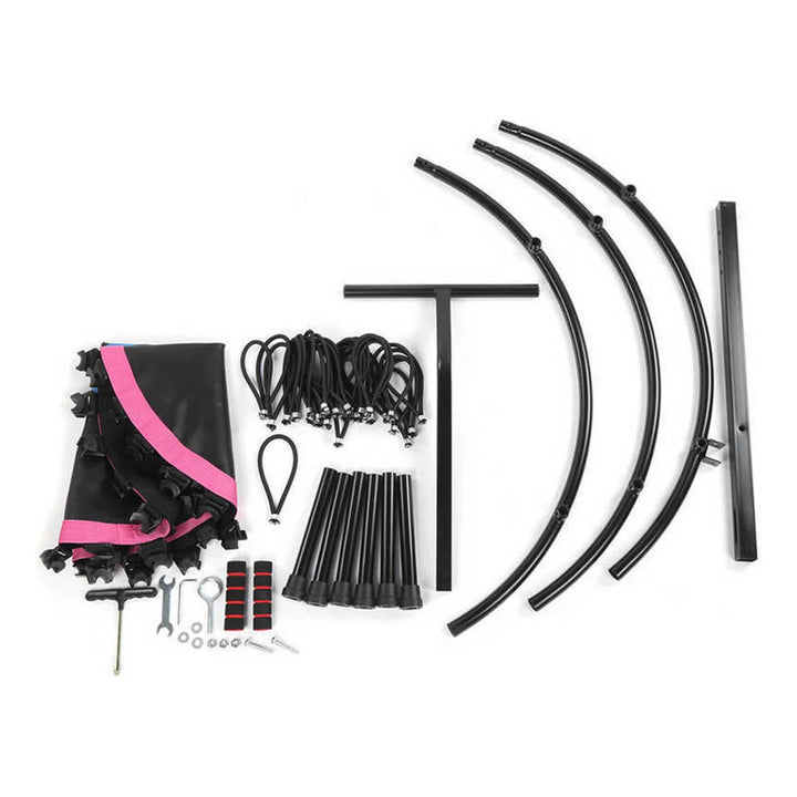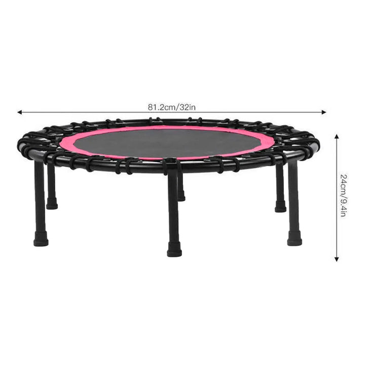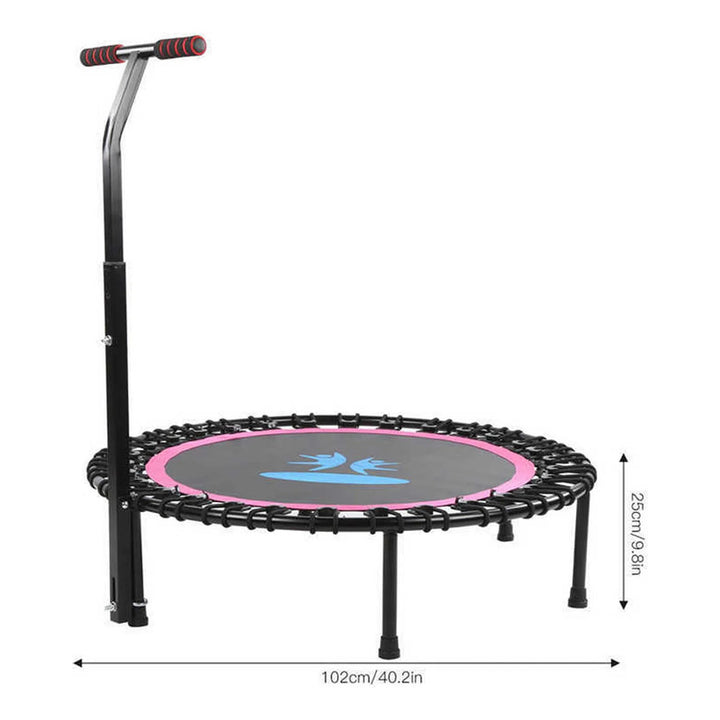 El trampolín tiene buena elasticidad. El sistema de diseño de cuerda elástica con 30 cuerdas gruesas proporciona una suspensión agradable para las articulaciones, que minimiza el ruido, proporciona una mayor estabilidad y le brinda una excelente experiencia de salto; Herramientas especiales incluidas para el montaje. El trampolín de fitness tiene un diseño de estructura estable con una superficie de rebote circular resistente al desgaste y al desgarro. Se compone de 30 bandas de goma, un tubo de acero grueso con un diámetro de 2,5 cm/1 pulgada y 6 patas que soportan la suspensión fácil de usar que pesa 250 kg. Las gruesas almohadillas de goma antideslizantes pueden proteger el suelo y reducir el ruido. La altura del reposabrazos del mango de espuma es ajustable, adecuado para personas de diferentes edades y requisitos de altura. Toda la familia puede utilizarlo para una variedad de actividades, niños haciendo yoga o saltando, y barras de gimnasia. El trampolín Fitness entrena varios grupos musculares, ayuda a construir masa muscular, fortalece los músculos de los hombros, las caderas y las piernas. Este tipo de trampolín interior es un buen equipo para perder peso. Es una excelente opción para los entrenadores de trampolín de bajo impacto para el hogar, el gimnasio, el yoga, el ejercicio físico, la pérdida de peso y el ejercicio aeróbico. Color: Negro con bordes rosa. Material de la estructura: Acero Material de estera : PP Diámetro: 102 cm Altura: 30 cm Número de cuerda elástica: 30 Incluye una práctico asa Requiere montaje: Sí