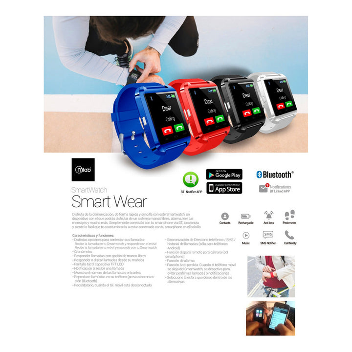 Descripción Disfruta de la comunicación, de forma rápida y sencilla con este Smartwatch, un dispositivo con el que podrás disfrutar de un sistema manos libres, alarma, leer tus mensajes y mucho más. Simplemente conéctalo con tu smartphone vía BT, sincroniza y siente lo fácil que te acostumbrarás a estar conectado con tu smarphone en el bolsillo. Características y funciones • Distintas opciones para contestar sus llamadas: Recibe la llamada en tu Smartwatch y responde con el móvil Recibe la llamada en tu móvil y responde con tu Smartwatch • Cronómetro • Responder llamadas con opción de manos libres • Responder o discar llamadas desde su muñeca • Pantalla táctil capacitiva TFT LCD • Notificación al recibir una llamada • Muestra el número de las llamadas entrantes • Reproduce la música en su teléfono (previa sincronización Bluetooth) • Recordatorio, cuando el tel. móvil está desconectado • Sincronización de Directorio telefónico / SMS / historial de llamadas (sólo para teléfonos Android) • Función disparo remoto para cámara (del smartphone) • Función de alarma • Función Anti-perdida: Cuando el teléfono móvil se aleja del Smartwatch, se desactiva para evitar perder las llamadas o notificaciones • Seleccione la esfera que desee dentro de las alternativas